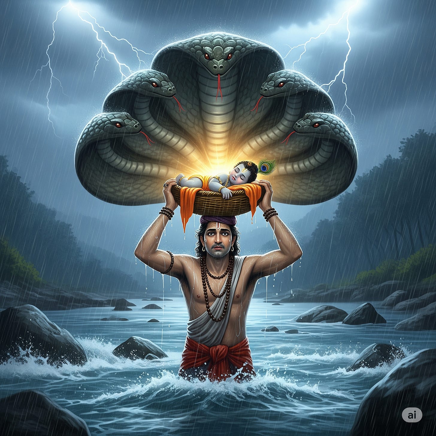The chains that bound Vasudeva fell away. The prison doors opened. The guards fell asleep. Nature paused. Not in defiance of physics, but in alignment with dharma. Because when your actions align with the cosmic order, the universe does not resist. It assists. The Yamuna River parted. The serpent Ananta Shesha rose to shield the child from rain. Vasudeva crossed into Gokula and made the divine exchange, placing Krishna beside Yashoda, and then took her baby girl back to Mathura.